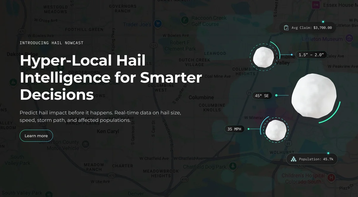 Predict hail impact before it happens. Real-time data on hail size, speed, storm path, and affected populations.